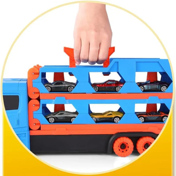 Pamiršk nuobodžius automobilius ar netvarką po žaidimų – šis automobilis–vilkikas su sulankstoma lenktynių trasa ir katapulta suteikia viską viename rinkinyje: transportavimą, lenktynes ir tvarkingą laikymą.
