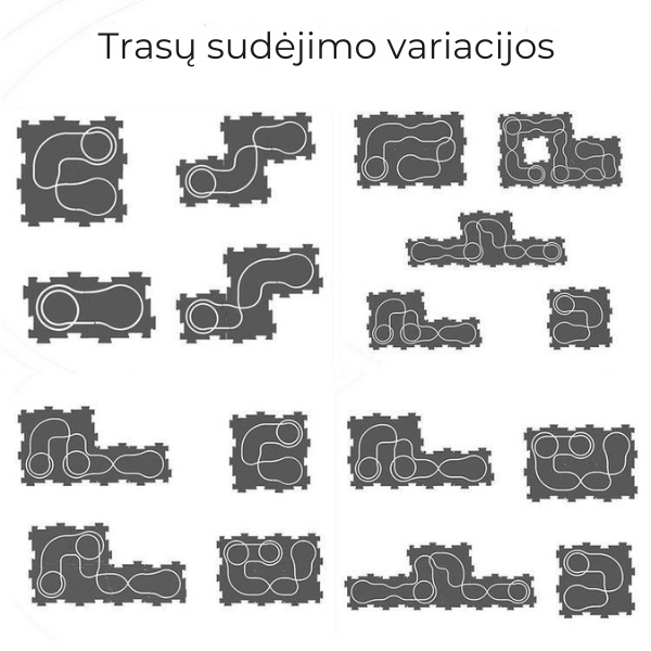 🧩 Kuri ir konstruoja – trasos elementai jungiasi daugybe būdų, tad kiekvienas žaidimas vis kitoks.