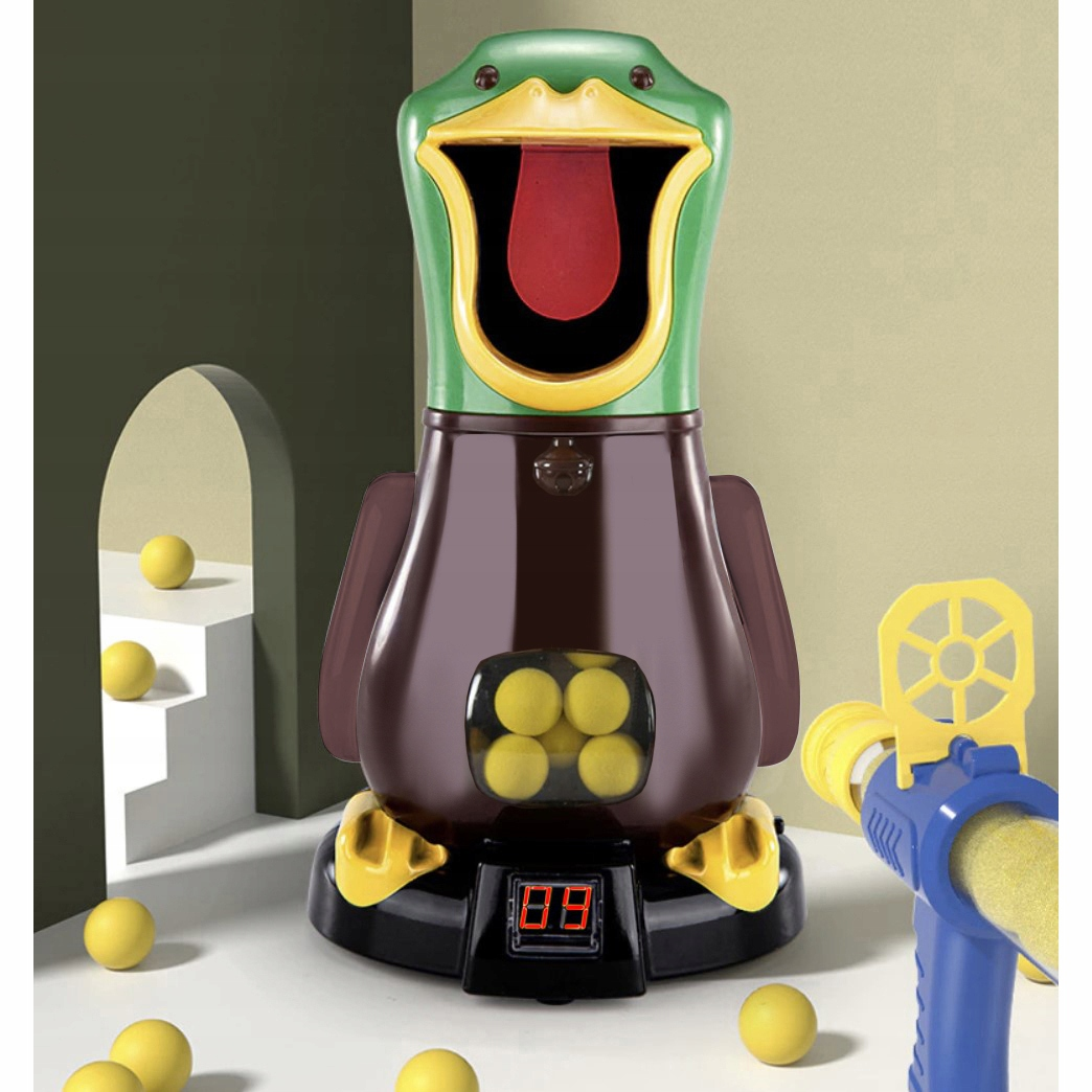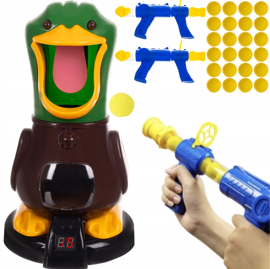 Padovanokite vaikams ne tik linksmybes, bet ir naudingą veiklą! Interaktyvus šaudymo žaidimas su antis taikiniu lavina vaikų rankų ir akių koordinaciją, reakciją bei dėmesio koncentraciją. Žaidimo esmė – pataikyti putplasčio kamuoliuku į anties liežuvį, kad kamuoliukas įkristų į vidų ir skaitiklis LCD ekrane automatiškai suskaičiuotų taškus.