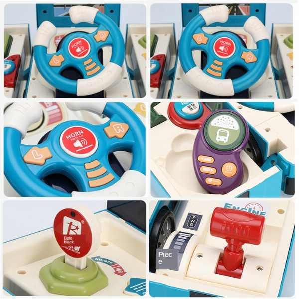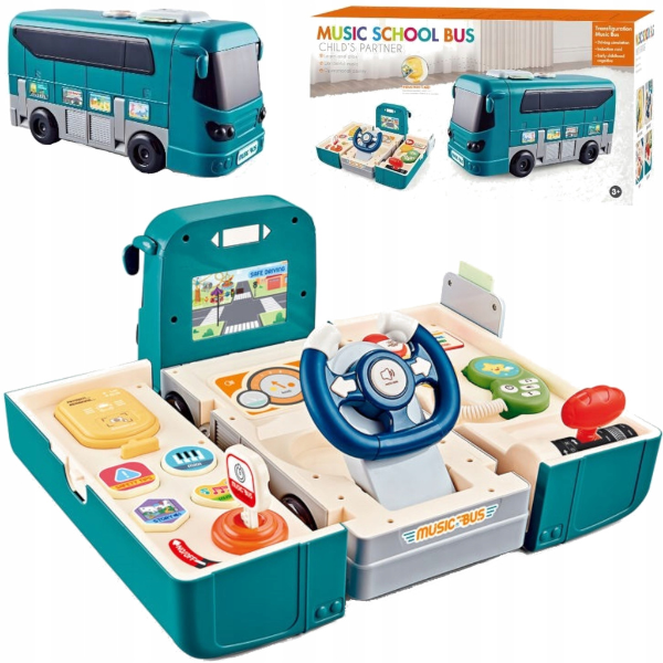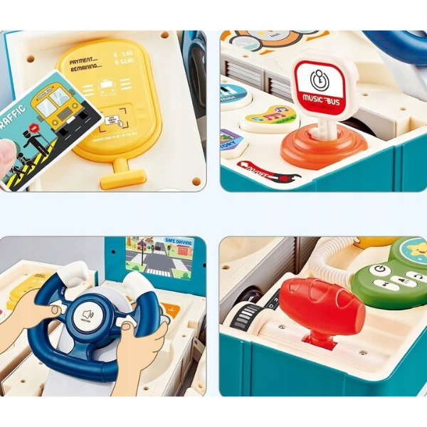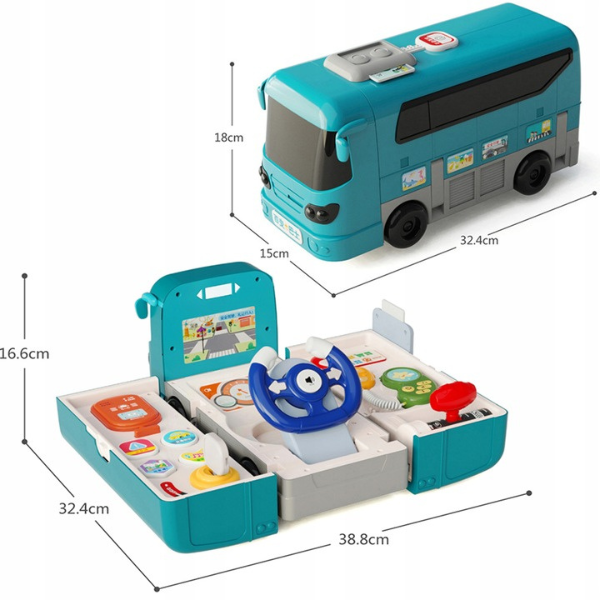 - Daugiafunkcis žaidimas: žaislinis autobusas transformuojasi į vairavimo simuliatorių su vairu, pavarų svirtimi ir posūkių signalais.