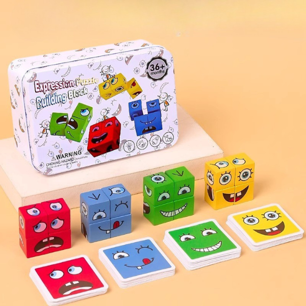 Suk raudonus, mėlynus ar geltonus kubelius, atkurk skirtingas veido išraiškas ir stebėk, kaip mažieji mokosi atpažinti jausmus – nuo džiaugsmo iki nuostabos!