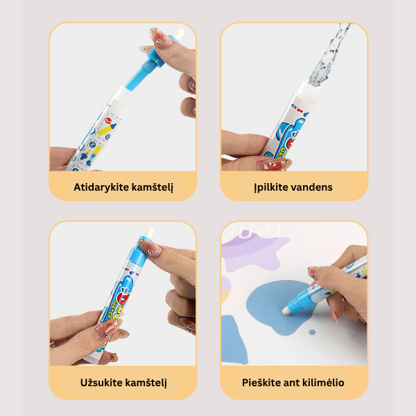 ✅ Be jokių dažų ir nešvarumų – piešimui naudojama tik paprasta vandens pripildyta rašiklio formos piešimo priemonė. Jokios netvarkos!