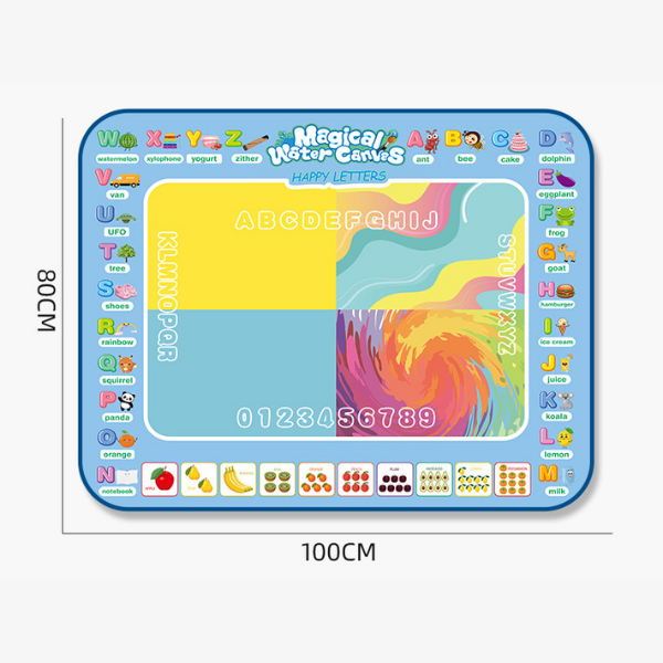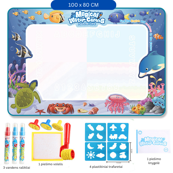 Magiškas vandens piešimo kilimėlis – tai inovatyvus žaidimas, leidžiantis vaikams piešti vandeniu, o kūriniai išdžiūvę pradingsta. Puikiai tinka kūrybinei veiklai tiek namuose, tiek kelionėje!