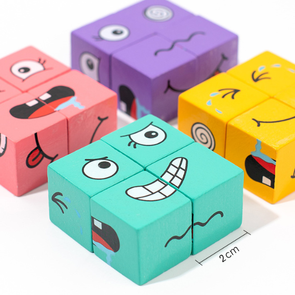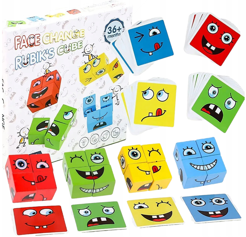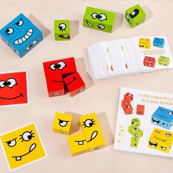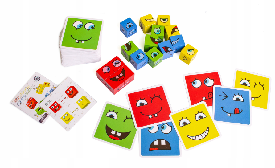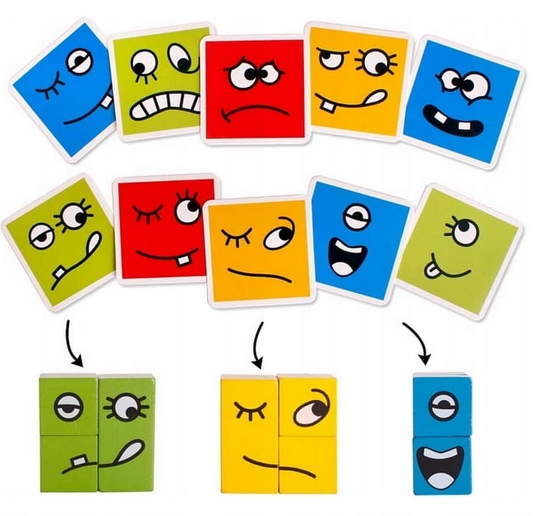 Vaikas išsitraukia emocijos kortelę ir turi atkurti ją su mediniais veidukų kubeliais – du kubeliai akims, kiti du – burnai. Žaidimą galima žaisti vienam, su draugu ar suaugusiuoju, varžytis kas greičiau surinks veiduką ir paspaus skambutį!