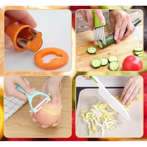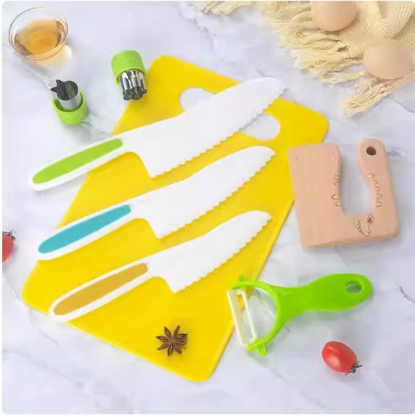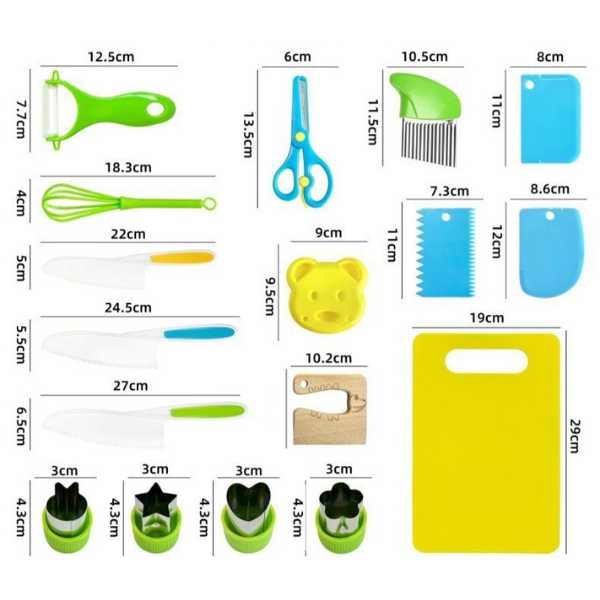 Su šiuo vaikišku saugių peilių rinkiniu galėsite kartu gaminti be streso! Peiliai pagaminti iš tvirto, bet saugaus plastiko – jie lengvai pjauna minkštus produktus, tačiau neįpjauna mažųjų pirštukų.