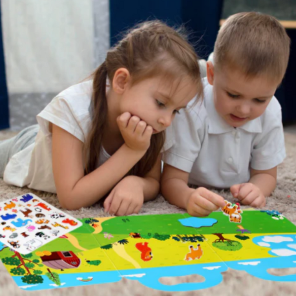 🦕 Linksmas ir interaktyvus mokymasis – klijuodami lipdukus vaikai pažįsta gyvūnus, transportą, gamtą ir dar daugiau