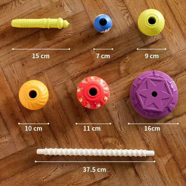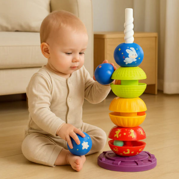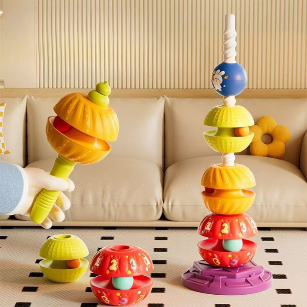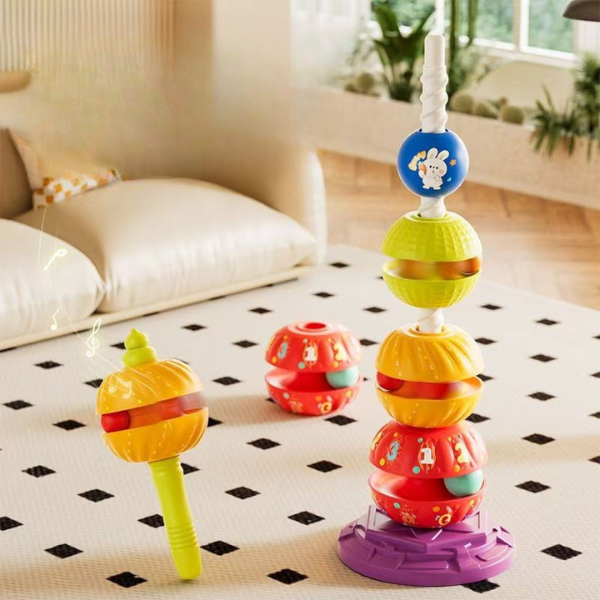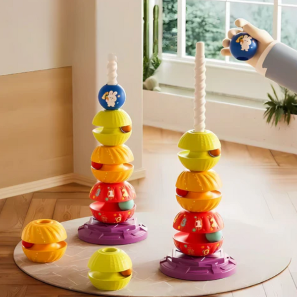 Šis spalvingas ir interaktyvus žaislas ne tik užima vaikus įdomia veikla, bet ir padeda vystytis svarbiems ankstyvojo amžiaus įgūdžiams. Sukdami ir dėliodami bokštą, vaikai lavina rankų miklumą, spalvų atpažinimą ir loginį mąstymą – žaidimas, kuris nepaliks abejingų!