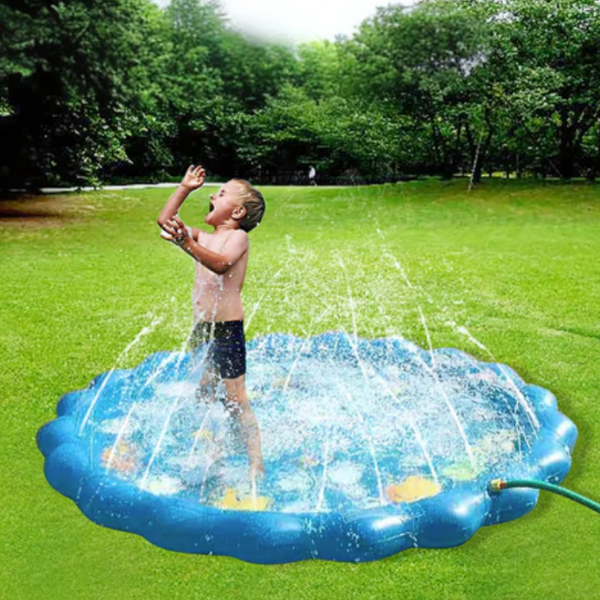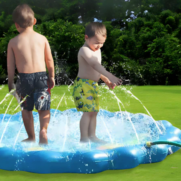 - 💧 Purškiantis vandens efektas – prijunk prie sodo žarnos ir stebėk, kaip kilimėlis virsta fontanu!